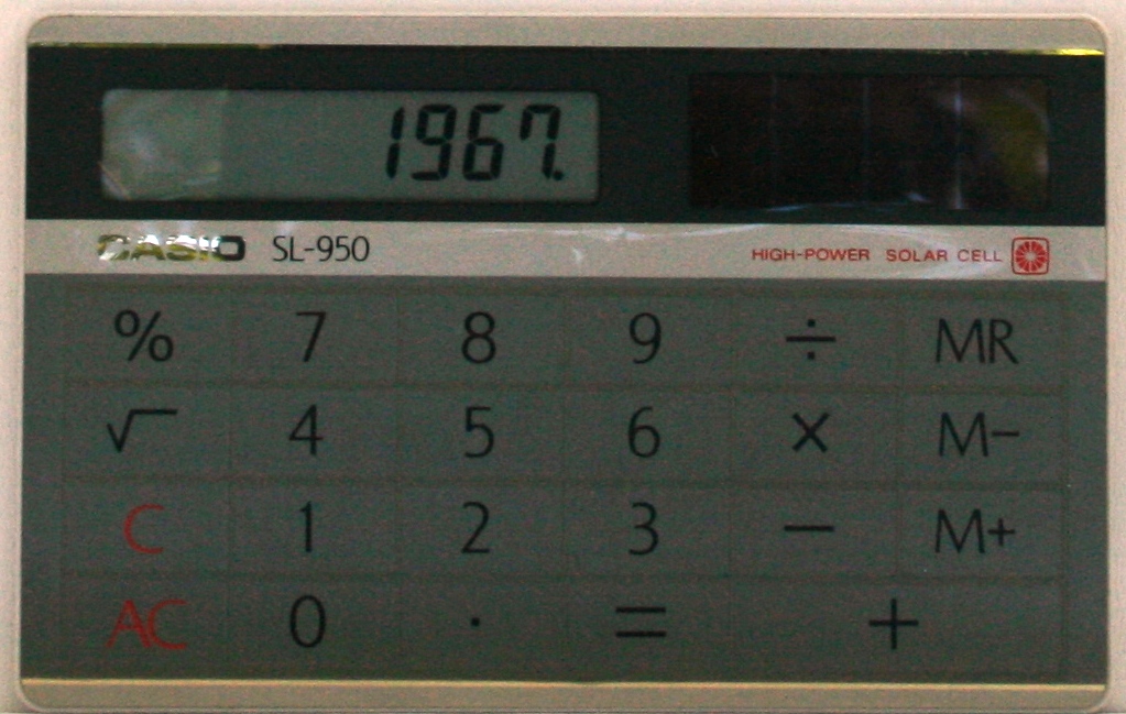 The Casio SL-950 is an arithmetic calculator with 8 digits precision and algebraic logic. It has 6 functions, 23 keys and an LCD (liquid crystal) display. The power source is Solar.