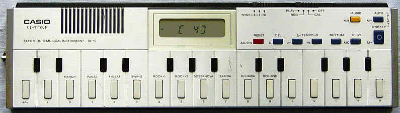 The smalest synthetiser of the world. With calculator functions.The Casio VL-10 is smaller than a chocolate bar and contains 2 separate piezo loudspeakers for main voice and rhythm.