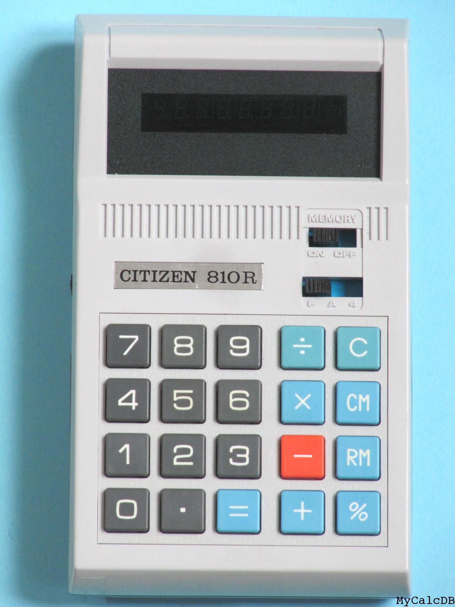 The Citizen 810R is an arithmetic calculator with 8 digits precision and algebraic logic. It has 5 functions, 20 keys and a VFD (vacuum fluorescent) display. The power source is 4xAA sealed.