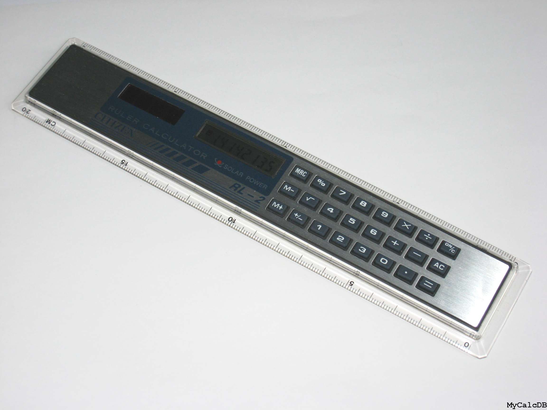 The Citizen RL-2 RULER CALCULATOR is an arithmetic calculator with 8 digits precision and algebraic logic. It has 7 functions, 24 keys and an LCD (liquid crystal) display. The calculator was manufactured in Taiwan.