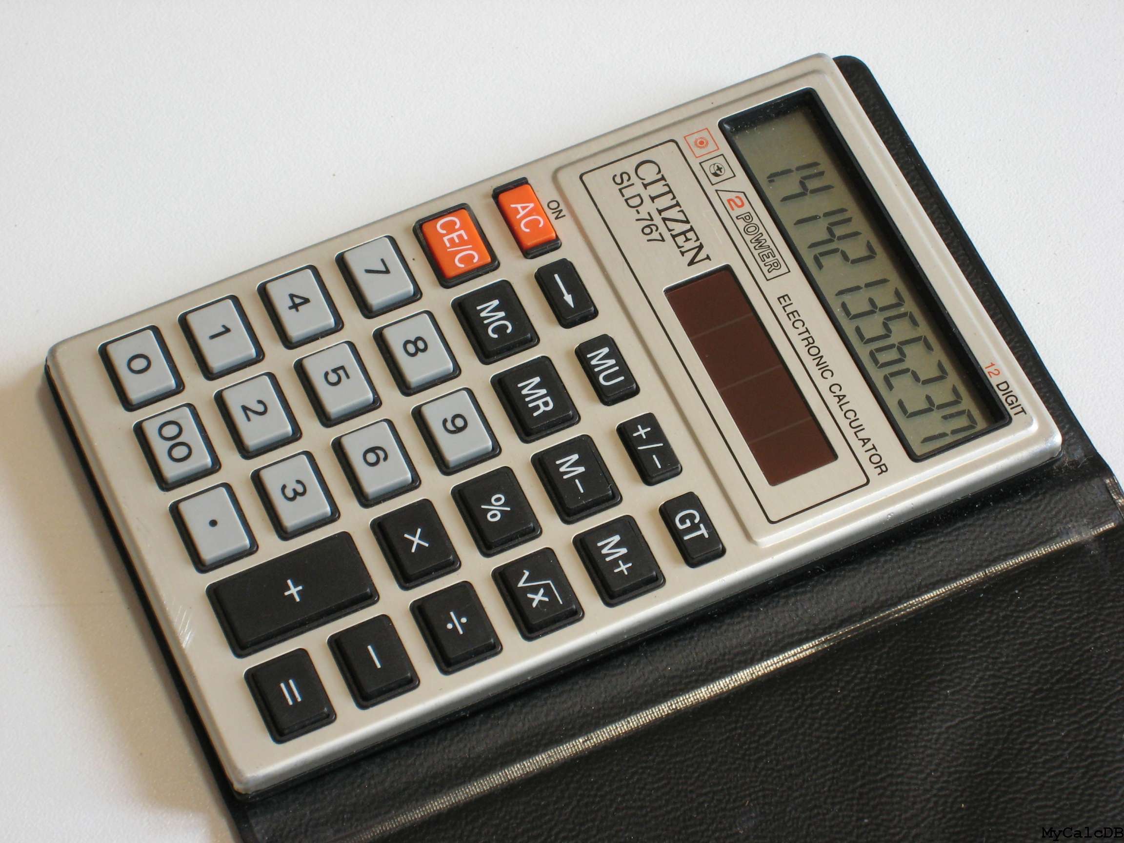 The Citizen SLD-767 is an arithmetic calculator with 12 digits precision and algebraic logic. It has 8 functions, 29 keys and an LCD (liquid crystal) display. The power source is 1.5V mercury cell.