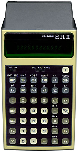 The Citizen SR-II is a scientific calculator with 8 digits precision and algebraic logic. It has 41 functions, 43 keys and a VFD (vacuum fluorescent) display. The power source is 2xAA batteries. The calculator was manufactured in Japan.