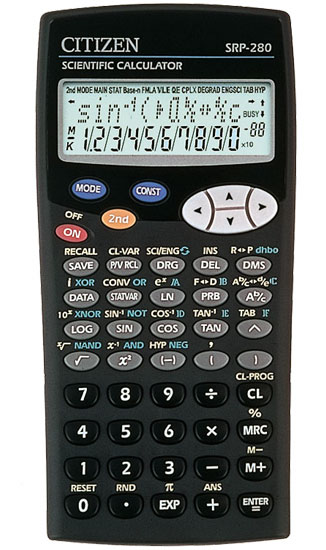 The Citizen SRP-280 is a programmable calculator with 10 digits precision and formula input logic. It has an unknown number of functions, unknown keys and an LCD (liquid crystal) display.