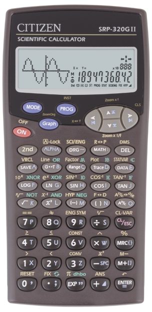 The Citizen SRP-320GII is a graphing calculator with unknown digits precision and formula input logic. It has an unknown number of functions, unknown keys and an LCD (liquid crystal) display.
