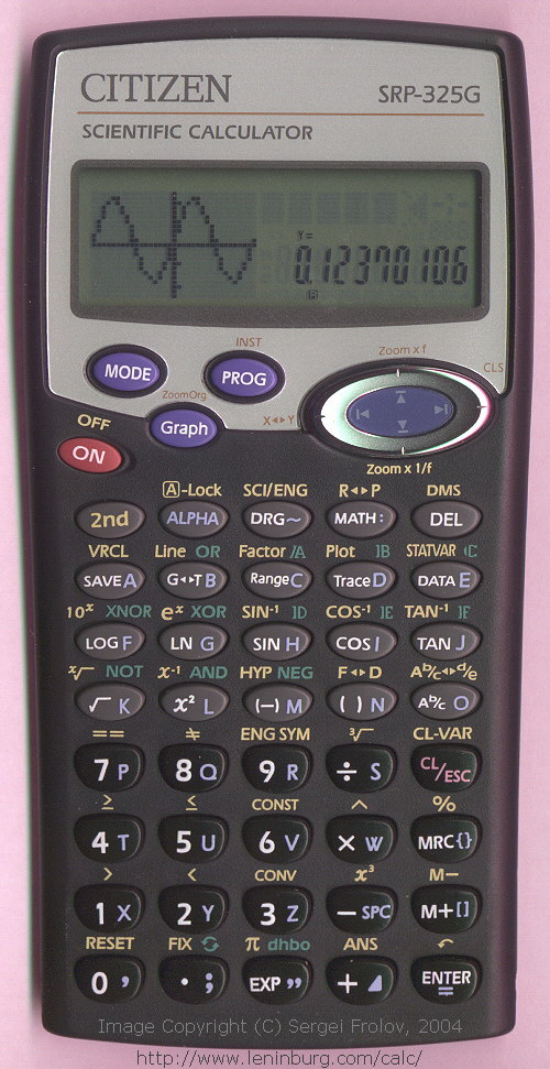 The Citizen SRP-325G is a graphing calculator with unknown digits precision and formula input logic. It has an unknown number of functions, unknown keys and an LCD (liquid crystal) display.