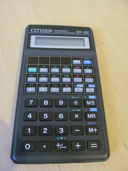 The Citizen SRP-45N is a programmable calculator with unknown digits precision and algebraic logic. It has an unknown number of functions, unknown keys and an LCD (liquid crystal) display.