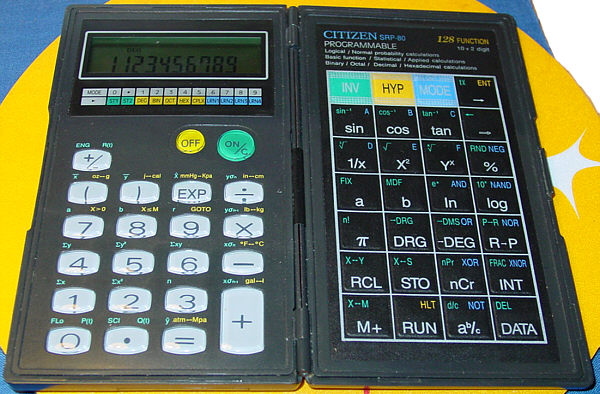 The Citizen SRP-80 is a programmable calculator with 10 digits precision and algebraic logic. It has 128 functions, 50 keys and an LCD (liquid crystal) display.