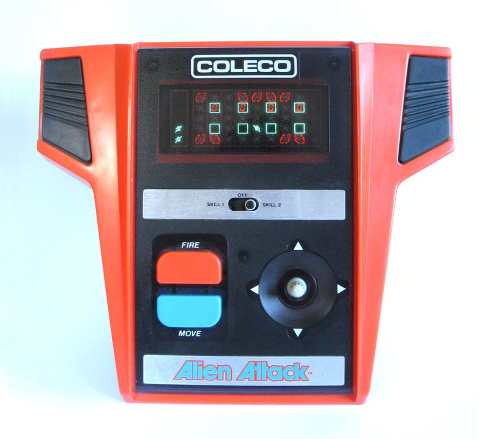Alien Attack is a 1979 handheld electronic game made by Coleco using a VFD display. It is housed in a bright orange, futuristic-styled case. The controls are a joystick, fire button, and move button. The player's ship can fire in any direction by moving the joystick with the fire button pressed. Movement only occurs when the move button is pressed. Firing while moving is not possible. There is a grid of barriers representing a city that the player can use for cover.