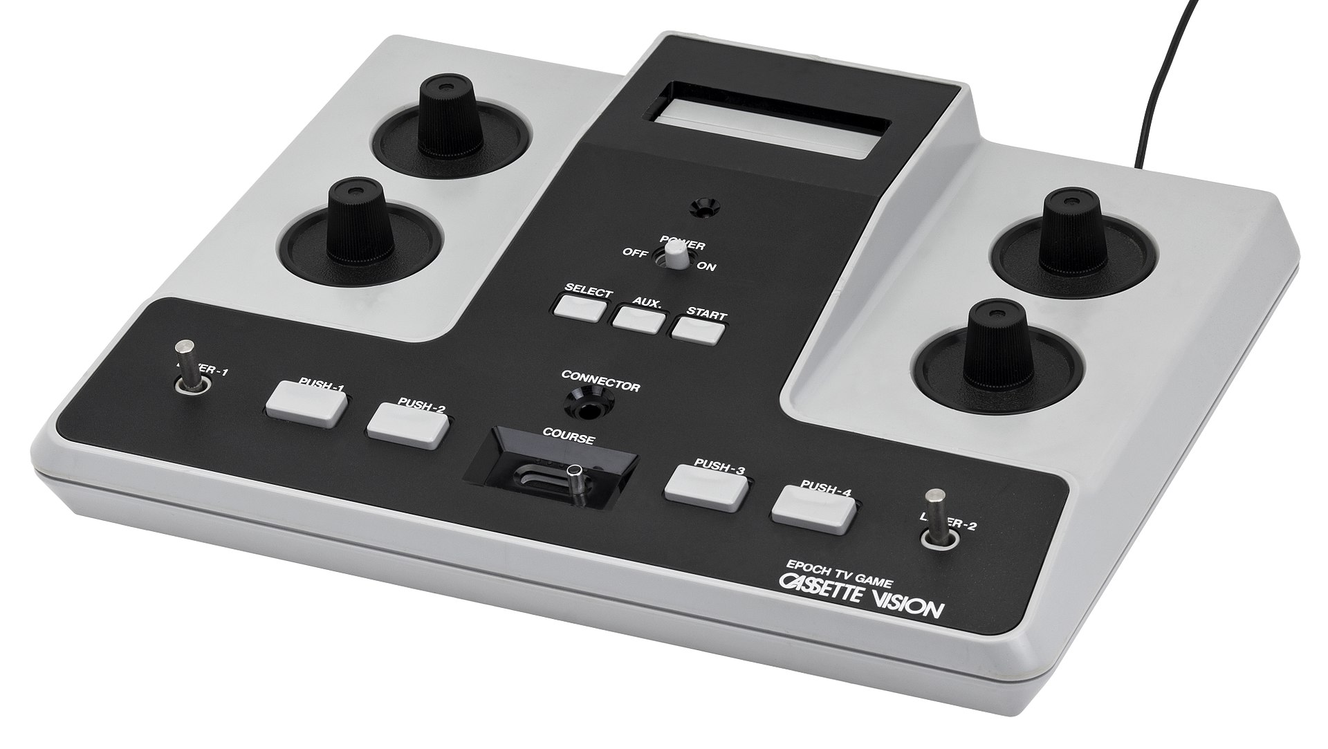 The Cassette Vision is a home video game console made by Epoch Co. and released in Japan on July 30, 1981. The Cassette Vision has unusual controls: four knobs built into the console itself, two for each player (one for horizontal, one for vertical); plus two buttons per player.