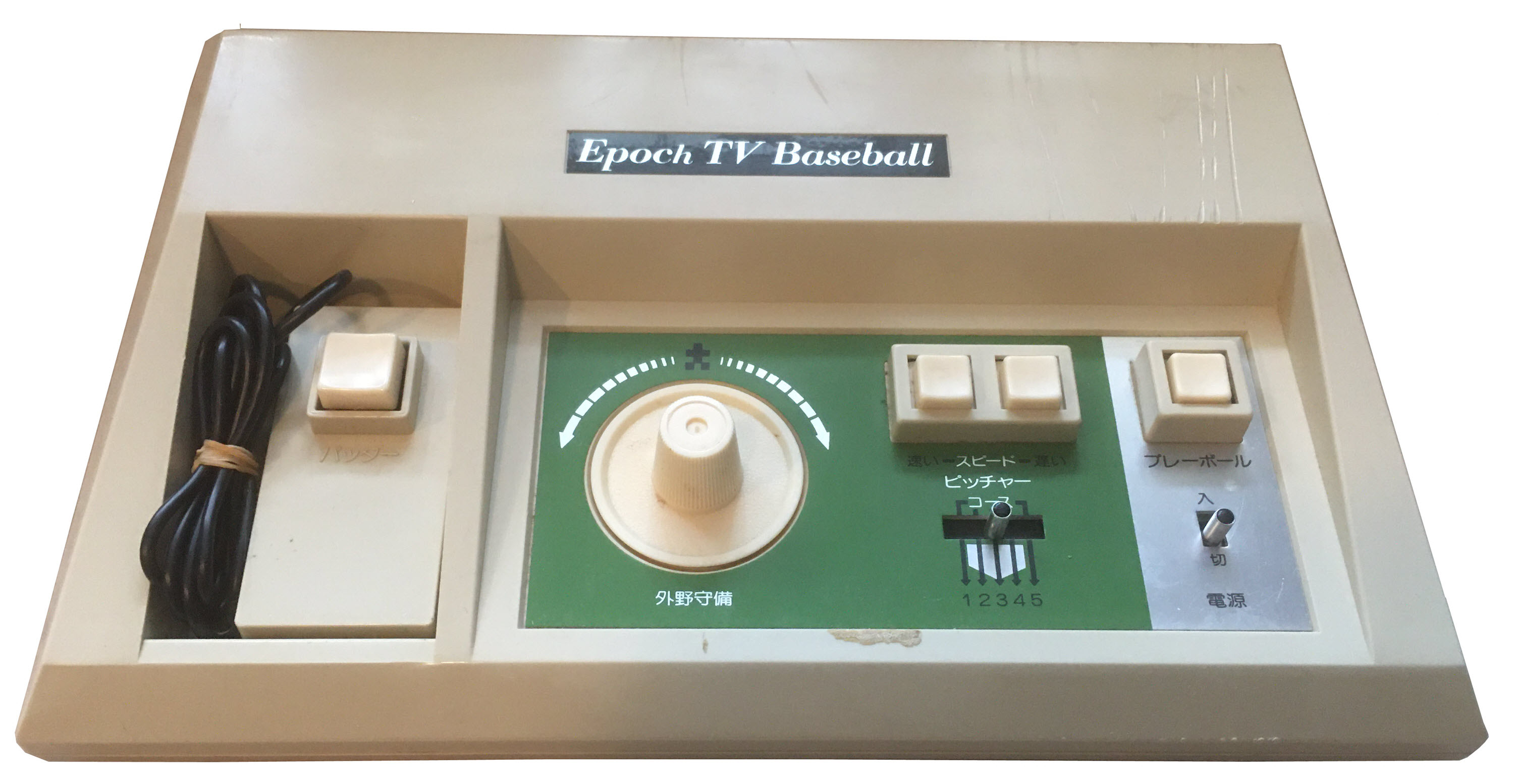 The console was Epoch’s videogame version of its famous Baseball Board. It was also Epoch’s first console that employed a microprocessor, the uPD77xx which had been jointly developed by Epoch and NEC. In this game two players switched off as pitchers and batters. The pitcher had access to buttons on the console to set the pitch. The batter used an external controller that featured a single button to bat at the appropriate time.