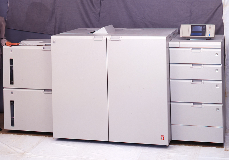The F6708B, announced in April 1997, was a high-speed multicolor cut-sheet printer. It was the first printer for the Fujitsu GS series and the Fujitsu M series that could print seven colors simultaneously (red, blue, yellow, green, light blue, pink, and black). The same effect as using preprinted forms could be obtained by using a color for overlays. And by printing text in various colors, documents could be made easier to read, more powerful, and more attractive.