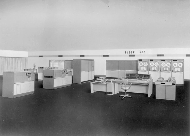 The FACOM 222 was the first transistor-based computer manufactured by Fuji Tsushinki Manufacturing Corporation (currently Fujitsu). Manufacturing of its prototype named as FACOM 222P ended in October 1960, and testing was completed in February of the following year (1961). Manufacturing of the commercial FACOM 222A, which was developed in parallel, finished in April 1961, and in November of that same year, the machine was delivered to Kyoei Life Insurance (later, the Business Machine Department of the company went independent and became the Kyoei Computation Center). This machine was the largest Japanese made general-purpose computer of the time. It employed numerical values in the fixed point format (sign + 12 digits) and floating point format (sign 1 digit, mantissa 10 decimal digits, exponent 2 digits (-50 to +49), and had operation speed performance of 160microsec./920microsec. (max.)/3,900microsec. for fixed point addition-subtraction/multiplication/division, and 350microsec./800microsec. (max.)/3,300microsec (average) for floating point addition-subtraction/multiplication/division. The memory unit was based on the magnetic drum in the FACOM 222P, but in the FACOM 222A, a 10,000 word magnetic core memory unit was used for main memory, and magnetic drums (10,000 word per drum, max. 100,000 words) were used as auxiliary memory. It was also possible to connect numerous input/output units, such as a maximum of 10 magnetic tape drives, thus enabling high-efficiency input/output operation. High-reliability was achieved by a complete check system, including checks based on 5C2 code for arithmetic operation, and these systems were widely used in facilities like trading companies, manufacturing businesses, universities and computation centers.