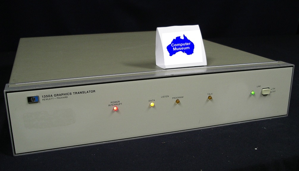 The 1350A was effectively a video interface used by digital computers to drive analog CRT monitors. The standard unit came with an HP-IB interface (52101A); 16-bit parallel (52103A) and RS-232-C interfaces (52102A) were also available. The 1350A was often used with the 9825 to give that computer large-screen output. The 9825 sent digital vector commands to the 1350A, which translated these commands to drive an analog monitor. The resultant display is very high resolution. This is because the electron beam on the monitor travels directly from one point on the phosphor screen to the next (whereas the electron beams on digital display scan the entire screen at a set frequency and resolution, illuminating only those dots specified by the program). The 1350A could also produce all 96 upper and lower case letters and most of the special characters in the full ASCII set.