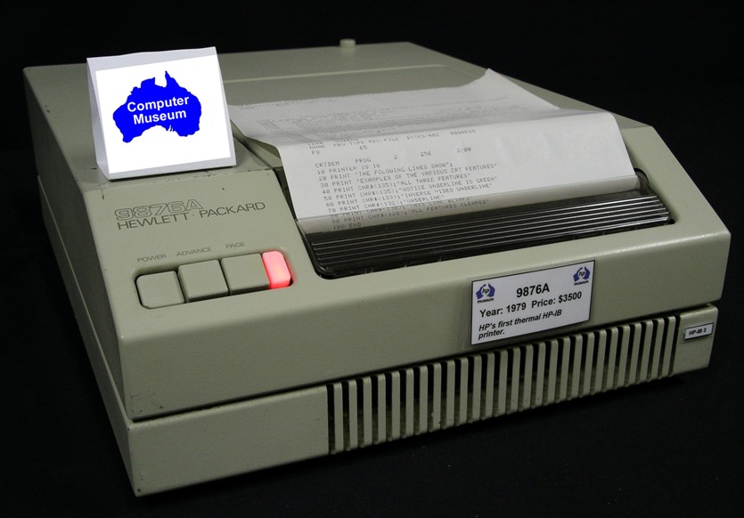 The 9876A printed text in a 5 x 7 dot cell matrix at 480 lines per minute. It printed graphics at a resolution of 77 dots per inch. The 9876A used fan-fold thermal paper rather than roll paper. It was available with an HP-IB or 8-bit parallel interface. The part number for the printer mechanism (without the steel casing) was 11479A.