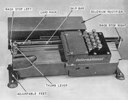IBM's Type 011 Electric Punch. Introduced in 1923, when IBM cards had 45 columns and round holes. This was the first punch with electric power; holes are punched by electromagnets rather than muscle power, at a great reduction in operator fatigue. Strictly numeric, the machine also includes a tabbing feature similar to typewriter tab stops.
