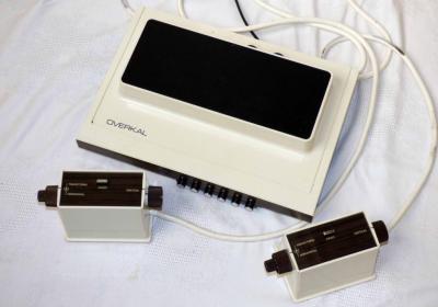 Overkal was released in 1973 by Inter Electronica S.A. It was a clone of the Magnavox Odyssey console. Odyssey cartridges contained a set of jumpers connecting the different Odyssey circuits together to play the games. Here, the cartridges were replaced by a set of five push-buttons connecting the circuits exactly as the cartridges did. Although Odyssey could play more games with additional cartridges, this clone can only play the games hard-wired by the push-buttons. Due to the limitations of the push-buttons, Overkal played seven games: Tenis (Tennis), Futbol (Football), Esqui (Ski), Ataque submarino (Submarine), Persecution (Cat and Mouse), Carrera espacial (Analogic), Ruleta (Roulette), and Tenis de Mesa (Table Tennis). Seven overlays of two sizes were provided. All the text originally written in English has ben translated into Spanish.