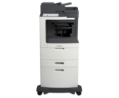 The Lexmark MX811dxe MFP with a customizable e-Task touch screen, 500-sheet offset stacker, 2,750-sheet input, 1GB of expandable memory and a 160+GB hard disk provides print, copy, fax, email and scan functions.