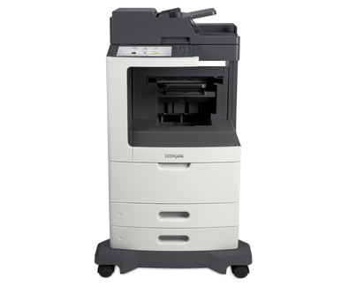The Lexmark MX812de MFP with a customizable e-Task touch screen, 500-sheet offset stacker, 1,200-sheet standard input, 1GB of standard memory and 160+GB hard disk provides print, copy, fax, email and scan functions.