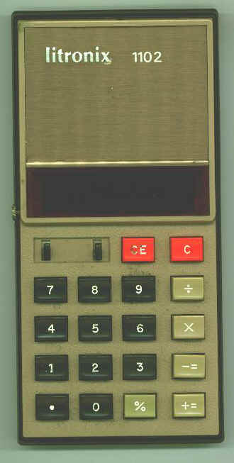 The Litronix 1102 is an arithmetic calculator with 8 digits precision and algebraic logic. It has 5 functions, 18 keys and an LED (light-emitting diode) display, typical of calculators of this era. The power source is 4xAA batteries.