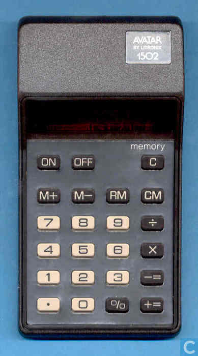 The Litronix 1502 AVATAR ; memory is an arithmetic calculator with 8 digits precision and algebraic logic. It has 5 functions, 23 keys and an LED (light-emitting diode) display, typical of calculators of this era. The power source is PP3 9V. The calculator was manufactured in Malaysia.
