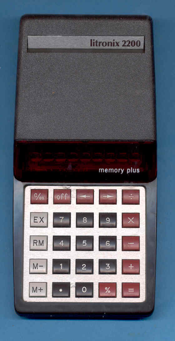 The Litronix 2200 memory plus is an arithmetic calculator with 8 digits precision and algebraic logic. It has 6 functions, 25 keys and an LED (light-emitting diode) display, typical of calculators of this era. The power source is 3xAA batteries.