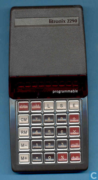The Litronix 2290 programmable is a programmable calculator with 8 digits precision and algebraic logic. It has 5 functions, 25 keys and an LED (light-emitting diode) display, typical of calculators of this era. The power source is 3xAA batteries.