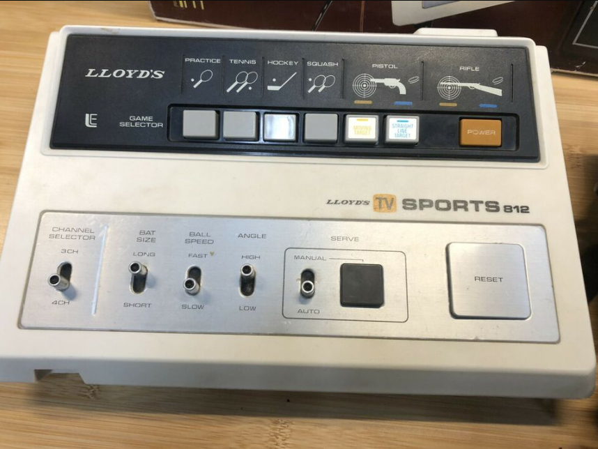 This Lloyd’s TV Sports console is the older 812 model, series No. 255A. Made in Japan. Games on the system (no cartridges) include tennis (singles and doubles), hockey, squash, pistol and rifle. It includes both controls and original cords (power cord and AV cord).