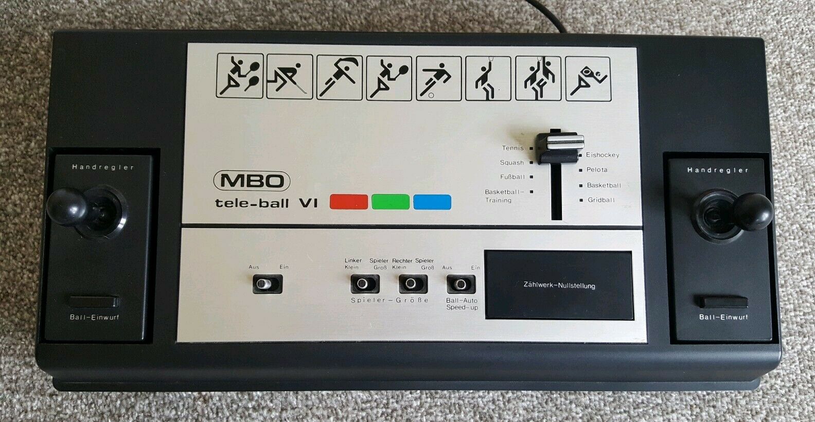 MBO Tele-Ball VI is a dedicated console playing eight Pong variants. The console uses the AY-3-8600 dedicated pong chip that plays eight games: Tennis, Hockey, Football, Squash, Practice, Basketball, Basketball Practice and Gridball. The games are in color and use joysticks allowing movement in all directions.