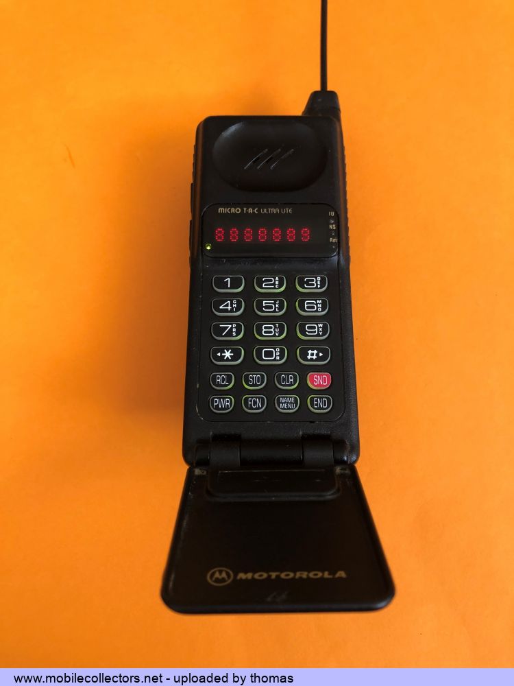 Motorola was able to take their popular MicroTAC Lite and reduce its weight from 7.7oz to 5.9oz, calling it the MicroTAC Ultra Lite. Like the earlier model, the Ultra Lite featured a dot matrix display and was able to store names in the phone book. In addition, the Ultra Lite was the first phone to feature the optional Vibracall alert, and came packaged with NiMH lite battery, offering 65 minutes talk time or 9 hours standby. Original MSRP: USD $999.99