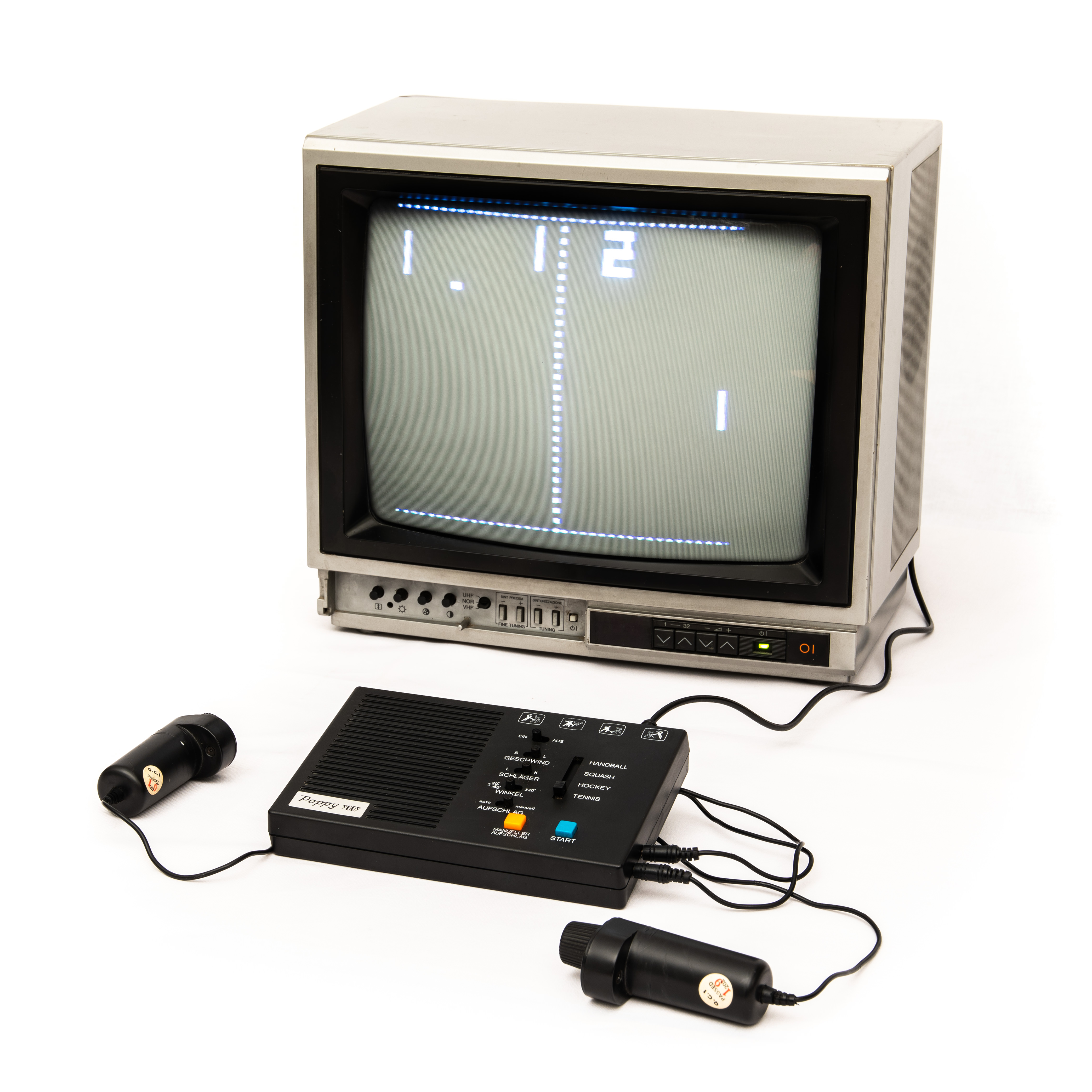 The Poppy 9009 was a clone of the famous game Pong. Sold in Germany,1977. It uses a "General Instruments AY-3-8500" pong-on-a-chip. It's connected to your home TV.