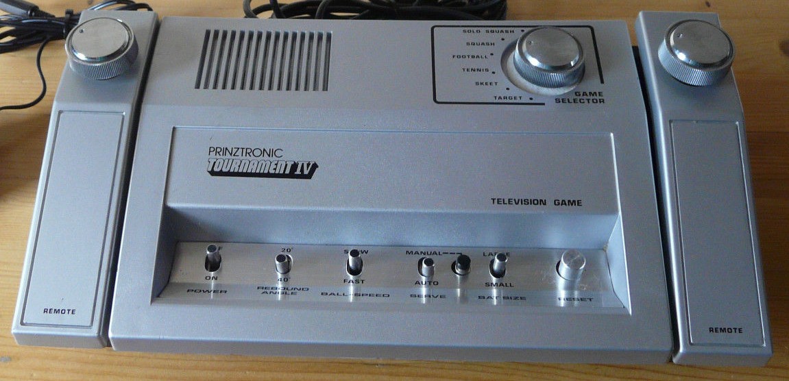 Prinztronic Tournament IV is a game console that offers the usual Pong-type games: squash, tennis, football, target practice. The two wired controllers can be removed from the unit.