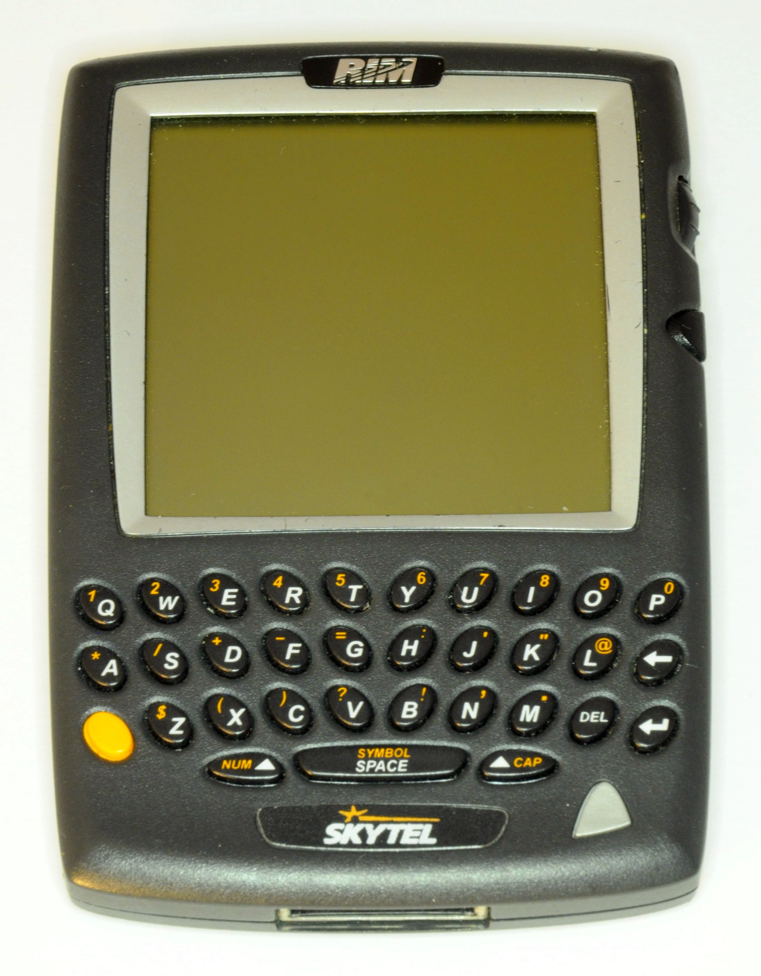 This is the RIM 957, one of the early 'wireless handheld' devices from RIM -- as BlackBerry was once called -- launched in 2000. Packing mobile email and a Qwerty keyboard, it was only sold in the company's native Canada. It was also notable for having no mobile connectivity -- so no voice calls here. The RIM 957 couldn't handle e-mail attachments and didn't have a Web browser by default, but back then, this was enough.