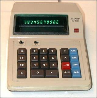The Sharp EL-1108 is an arithmetic calculator with 10 digits precision and algebraic logic. It has an unknown number of functions, 25 keys and a VFD (vacuum fluorescent) display.