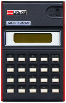 The Sharp EL-200 ELSIMATE is an arithmetic calculator with 8 digits precision and algebraic logic. It has 6 functions, 20 keys and one of the early LCD (liquid crystal) displays which incorporated a yellow filter. The power source is PP3 9V.