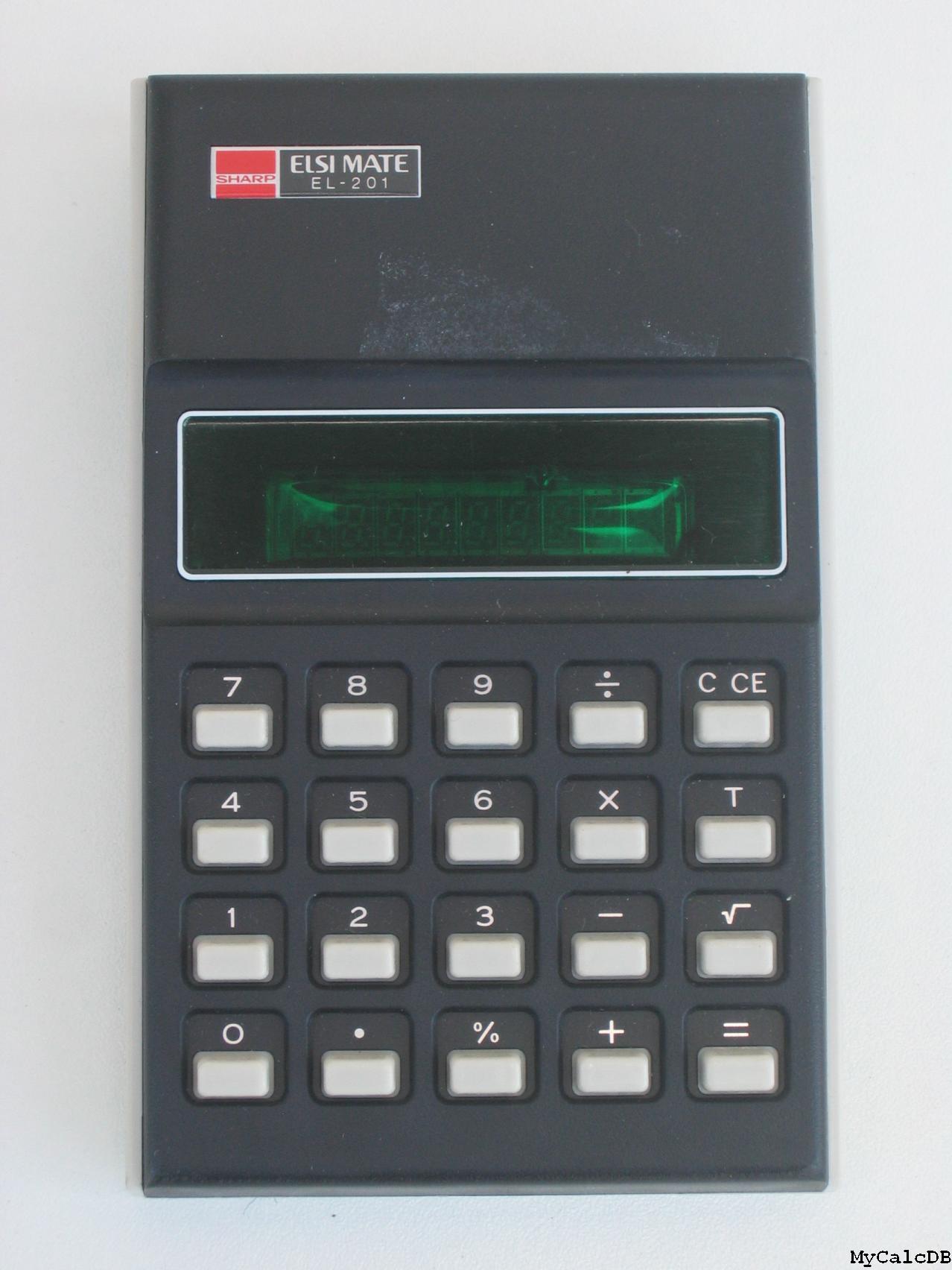 The Sharp EL-201 ELSIMATE is an arithmetic calculator with 8 digits precision and algebraic logic. It has 6 functions, 20 keys and a VFD (vacuum fluorescent) display. The power source is 2xAA batteries.