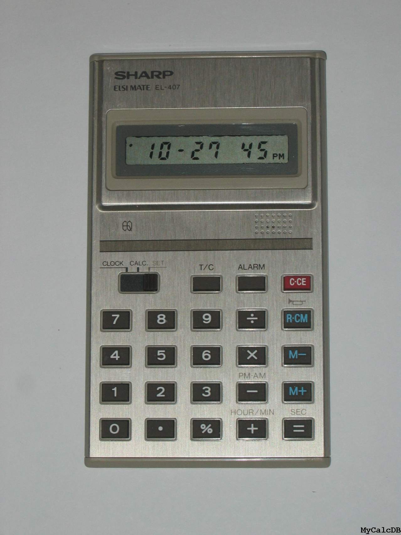The Sharp EL-407 ELSIMATE is an arithmetic calculator with 8 digits precision and algebraic logic. It has 5 functions, 24 keys and an LCD (liquid crystal) display. The power source is 2xLR44.