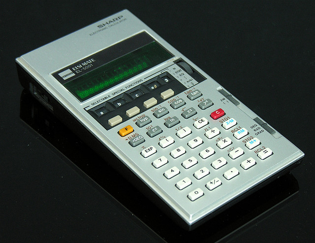 The Sharp EL-5001 ELSIMATE is a scientific calculator with 10 digits precision and algebraic logic. It has 37 functions, 39 keys and a VFD (vacuum fluorescent) display. The power source is 2xAA batteries.