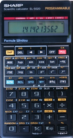 The Sharp EL-5020 is a programmable calculator with 10 digits precision and algebraic logic. It has 202 functions, 44 keys and an LCD (liquid crystal) display. The power source is 2xLR44. The calculator was manufactured in Taiwan.