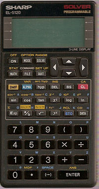 The Sharp EL-5120 SOLVER is a graphing calculator with 10 digits precision and algebraic logic. It has an unknown number of functions, 47 keys and an LCD (liquid crystal) display. The power source is CR2025 3V.