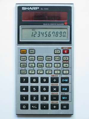 The Sharp EL-545 is a scientific calculator with 10 digits precision and algebraic logic. It has 48 functions, 42 keys and an LCD (liquid crystal) display. The power source is Solar.