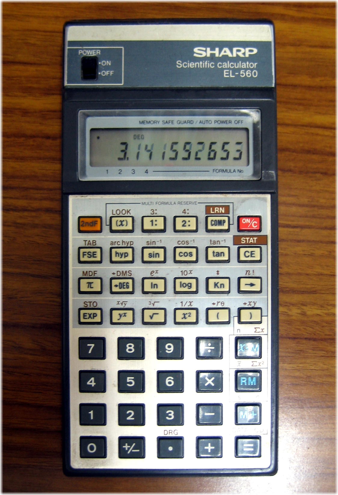 The Sharp EL-560 is a programmable calculator with 10 digits precision and algebraic logic. It has an unknown number of functions, 44 keys and an LCD (liquid crystal) display.