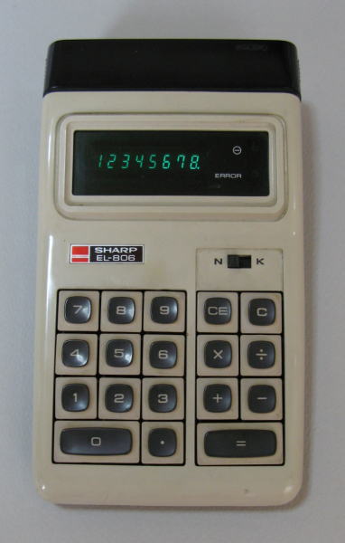 The Sharp EL-806 is an arithmetic calculator with 8 digits precision and algebraic logic. It has 4 functions, 18 keys and a VFD (vacuum fluorescent) display. The power source is 4xAA batteries.