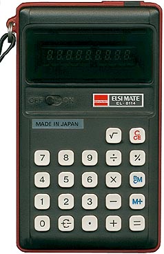 The Sharp EL-8114 ELSIMATE is an arithmetic calculator with 8 digits precision and algebraic logic. It has 7 functions, 22 keys and a VFD (vacuum fluorescent) display. The power source is 4xAA batteries.