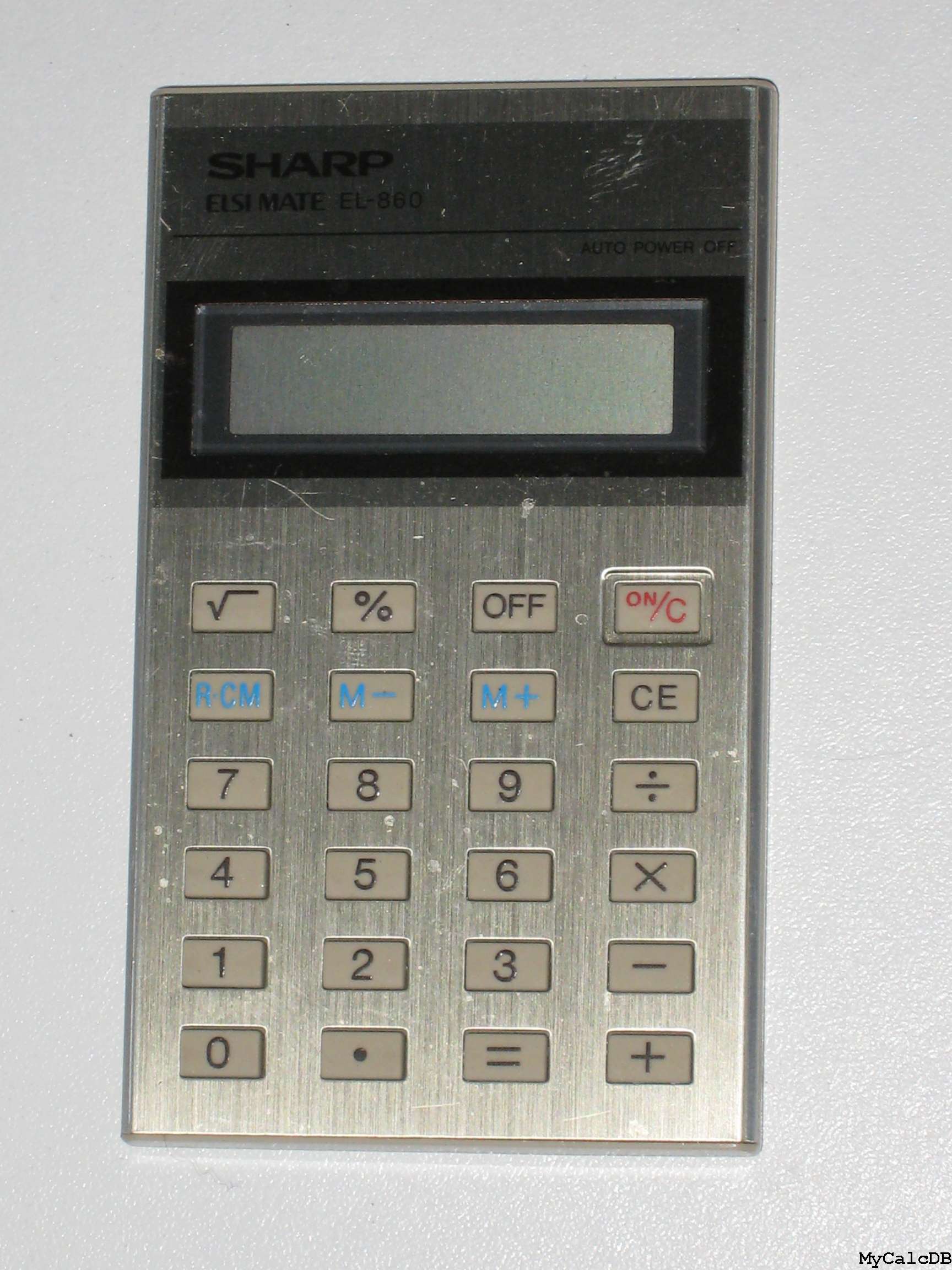 The Sharp EL-860 is an arithmetic calculator with 8 digits precision and algebraic logic. It has 6 functions, 20 keys and an LCD (liquid crystal) display. The power source is 2xLR1130.