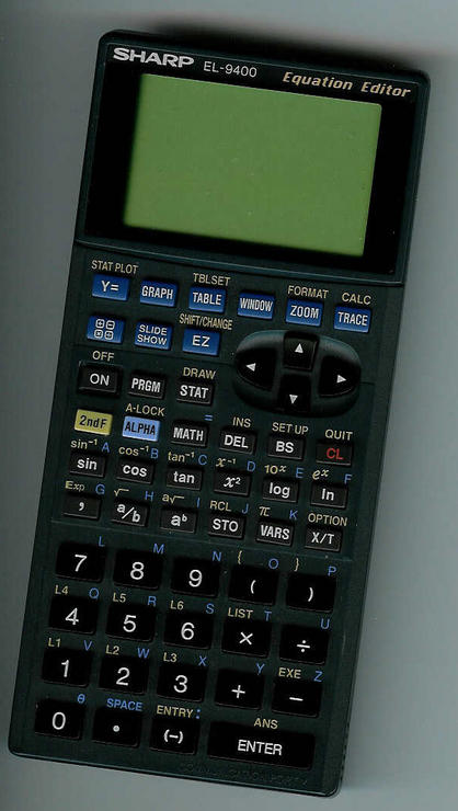 The Sharp EL-9400 is a graphing calculator with 10 digits precision and formula input logic. It has an unknown number of functions, unknown keys and an LCD (liquid crystal) display.