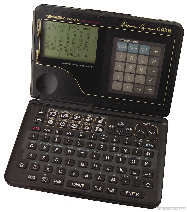 The Sharp IQ-7720M is an arithmetic calculator with 10 digits precision and algebraic logic. It has an unknown number of functions, 98 keys and an LCD (liquid crystal) display. The power source is 2xCR2032 3V.