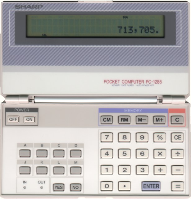 The Sharp PC-1285 is a programmable calculator with 10 digits precision and algebraic logic. It has an unknown number of functions, 38 keys and an LCD (liquid crystal) display. The power source is 3xCR2032 3V.