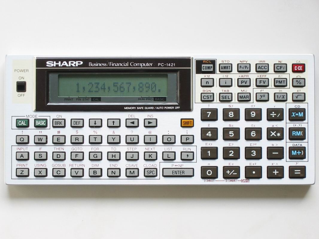 The Sharp PC-1421 is a programmable calculator with 12 digits precision and formula input logic. It has an unknown number of functions, 76 keys and an LCD (liquid crystal) display. The power source is 2xCR2032 3V.