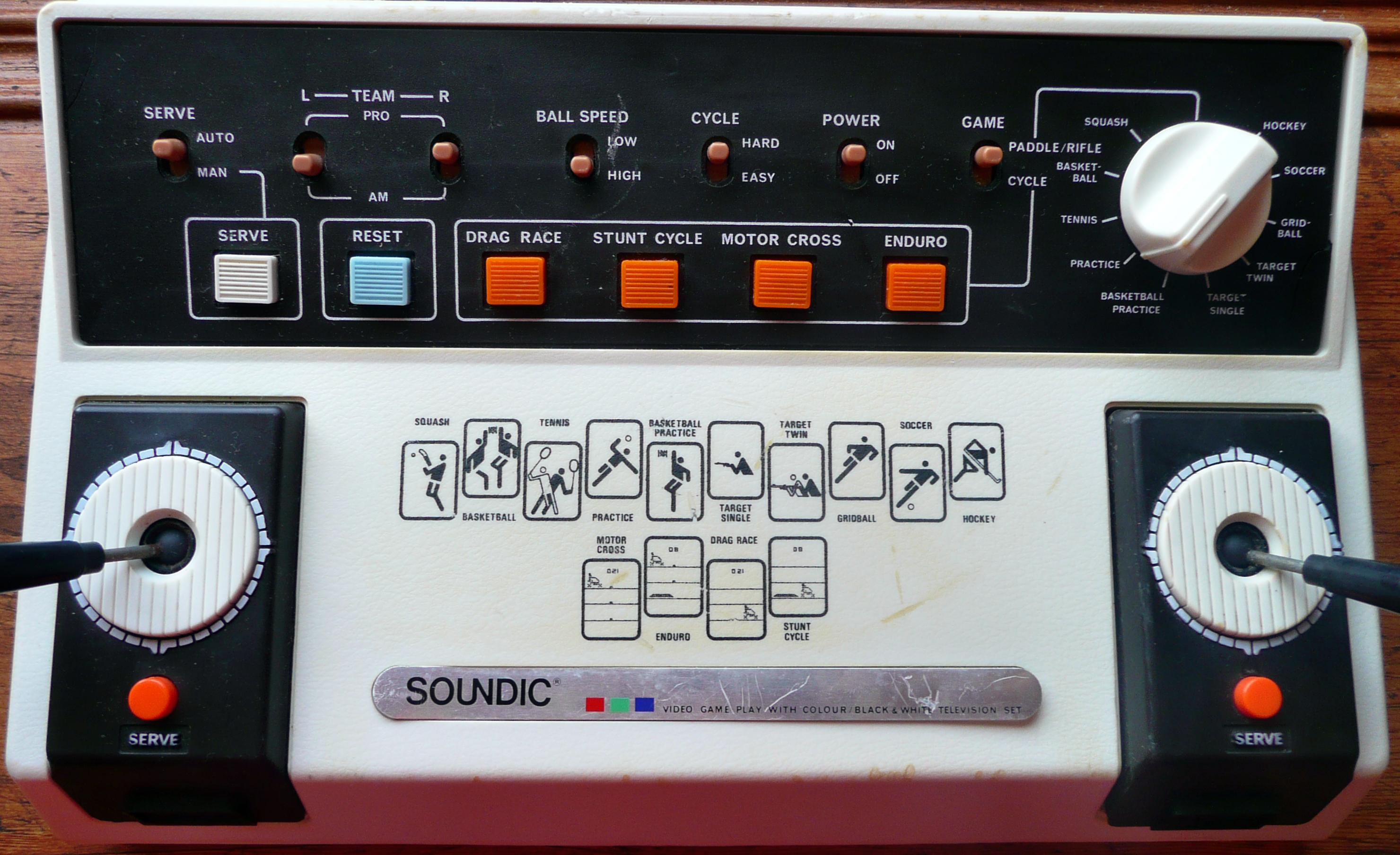 SD-062 TV-18 is a dedicated console that features 14 game modes. The console combines the AY-3-8610 and AY-3-8760 chips to provide the following games: Squash, Practice, Basketball, Basketball Practice, Tennis, Target Single, Target Twin, Gridball, Soccer, Hockey, Motor cross, Enduro, Drag Race and Stunt Cycle. The pong games have settings for manual or automatic serve, ball speed, and pro/amateur setting for both players. The motocross games have two difficulty levels.