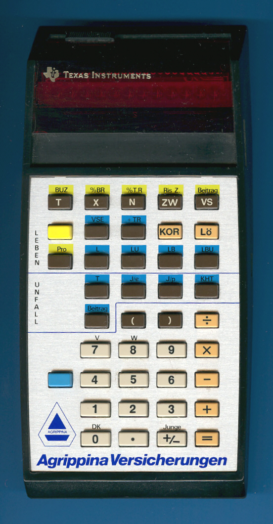 The innovative TI-58 was the perfect base for a lot of customized calculators. This one was used end of the 70th by insurance agents of the German Agrippina company. The idea behind these products was the novelty of the Solid State Software Modules™ with up to 5000 program steps.